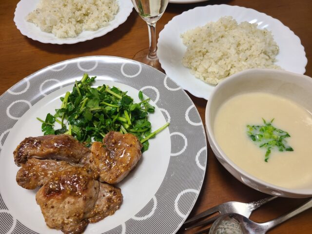 ケンジはシロさんの誕生日ディナーで調理しており、食後のケーキもあるため控えめな量ですが、