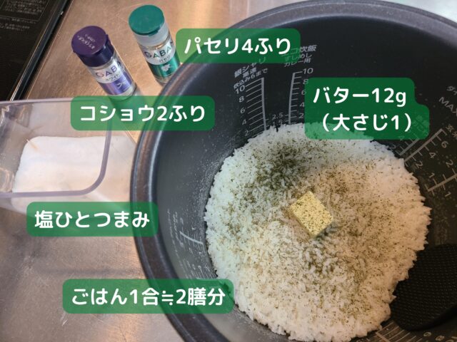 3.炊いたごはんに、塩ひとつまみ、コショウ2ふり、乾燥パセリ4ふり、バター12gを入れる。
