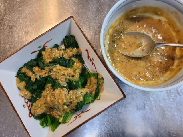 3.ほうれん草のおひたしにたっぷりとピリ辛ねぎゴマだれをかける。