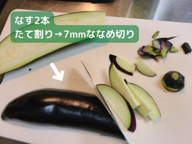 1.なす2本のヘタをおとしてたて半分に割り、7mm幅の斜め切りにする。