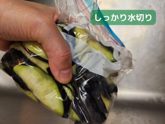 8.15分塩水に漬けたなすをかるく水切りする。