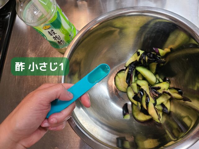 10.ボウルに水気をしぼったなすを入れ、酢小さじ1を加えてしっかりと味を混ぜなじませる。