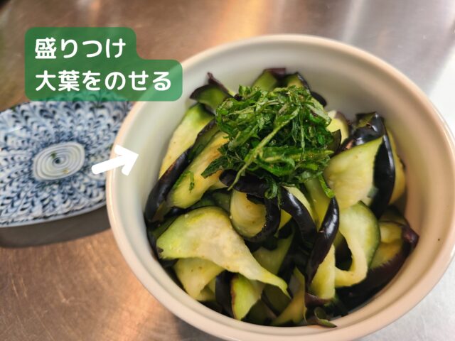 11.酢と和えたら、なすの浅漬けを器に盛りつけ、切っておいた大葉の千切りを上にのせる。