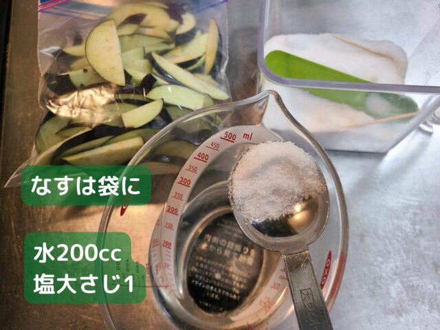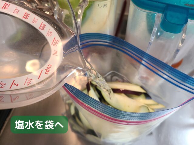3.なすを入れた袋に作った塩水を加える。