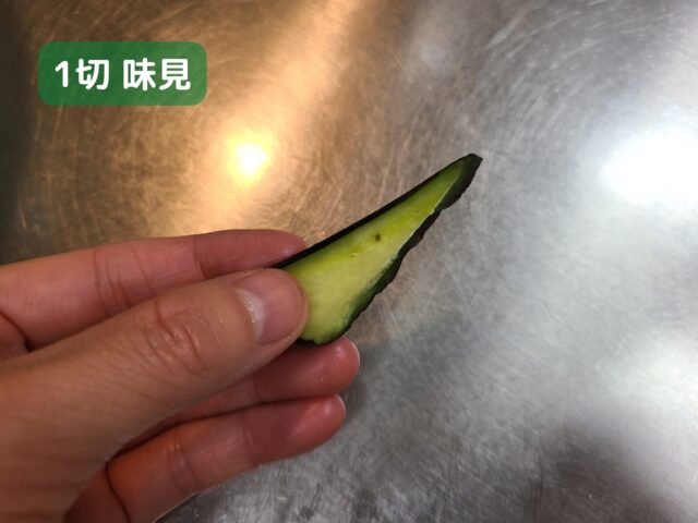9.かるく水気をしぼったら、一切れなすを取り出して味見をする。