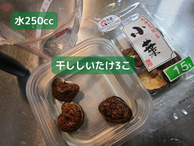 0.あらかじめ干ししいたけ3こを水250㏄につけて戻しておく。