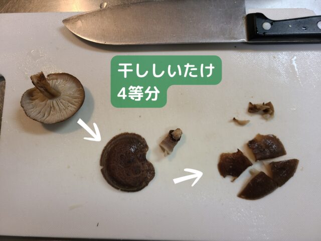 8.干ししいたけ3こは軸をとって4等分に切り分ける。