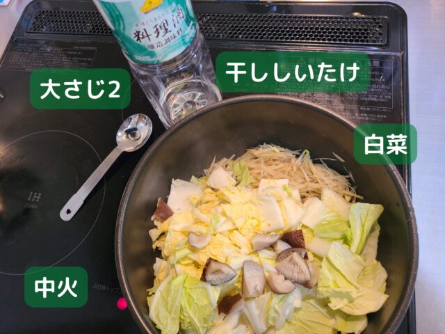 本記事では、このタイミングで干ししいたけの軸も加えています。