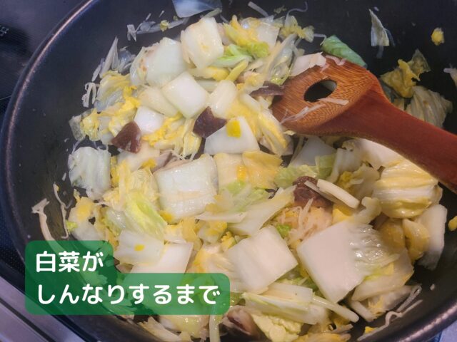 12.白菜がしんなりとするまで5分ほど中火で炒める。