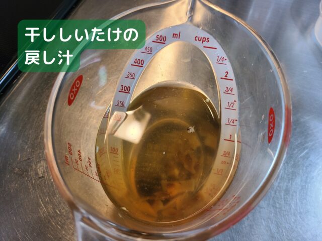 しいたけの戻し汁はこのあとスープに活用するため、捨てないように注意!