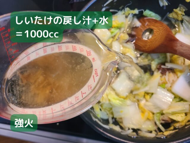 14.鍋にしいたけの戻し汁+水(1000㏄)を加え、強火にする。
