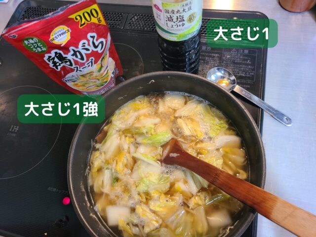 15.鍋に、鶏がらスープの素大さじ1強と、しょうゆ大さじ1を加え、3分ほど煮る。