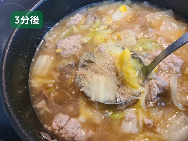 原作では春雨を入れる直前まで事前調理し、食べる前にスープをあたため直して春雨を加えていました。