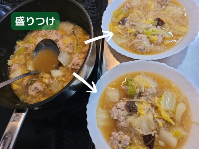 21.出来上がった白菜と肉団子のスープをスープ皿に盛りつける。