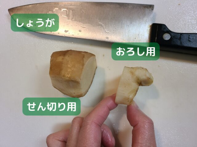 2.しょうがひとかけの皮をむき、おろし用とせん切り用に切り分ける。