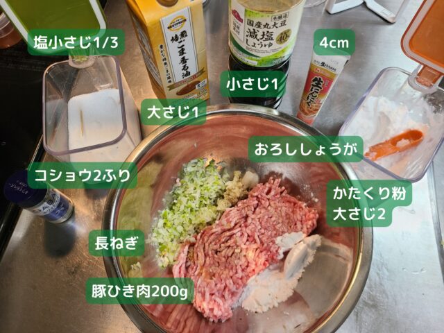 ボウルに、豚ひき肉200g、みじん切りにした長ねぎ、おろしたしょうが、かたくり粉大さじ2、おろしにんにくチューブ4cm分、しょうゆ小さじ1、ごま油大さじ1、塩小さじ1/3、コショウ2ふりを入れる。