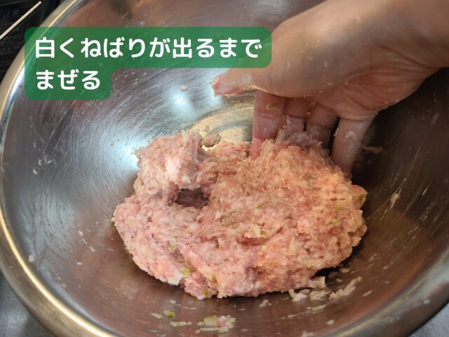 6.ボウルに入れた材料を手で白くねばりが出るまで混ぜ合わせる。