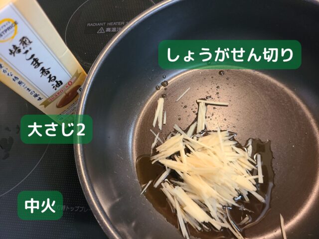 10.深めの鍋にごま油大さじ2とせん切りにしたしょうがを加え、中火で香りが出るまで炒める。
