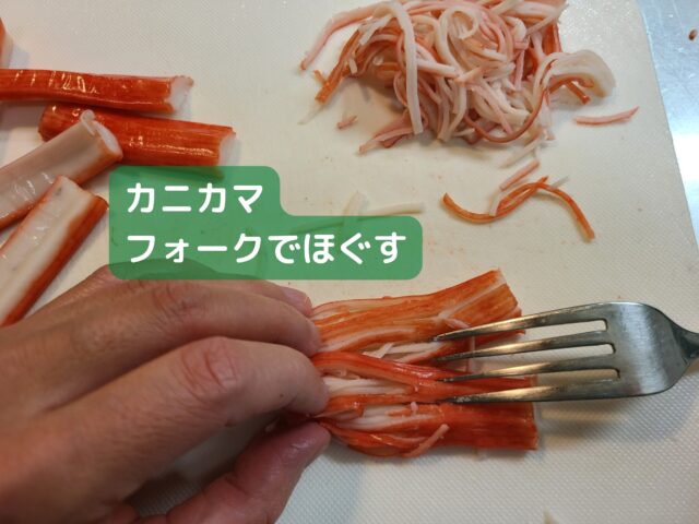 12.カニカマ1袋すべてをフォークでほぐす。