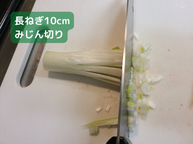 13.長ねぎ10cmは縦に切りこみを入れてからみじん切りにする。