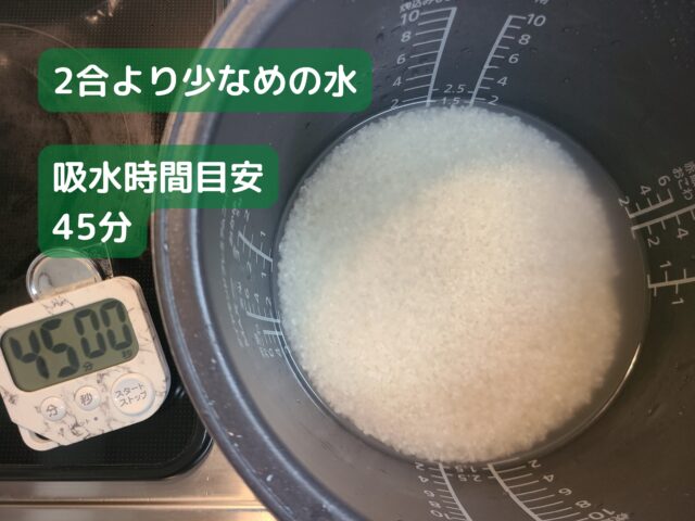 2.2合分より少なめの水を入れ(あとで調味料を加えるため)、45分ほどおいて米を吸水させる。