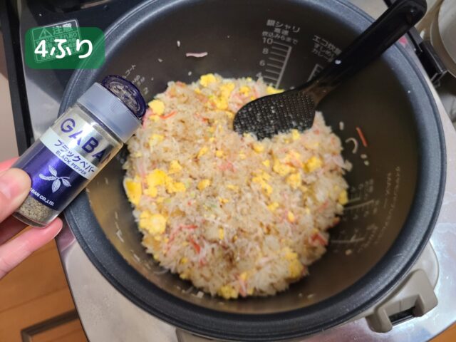 15.仕上げに黒コショウを4ふりかけて、チャーハンとまぜあわせる。