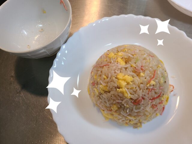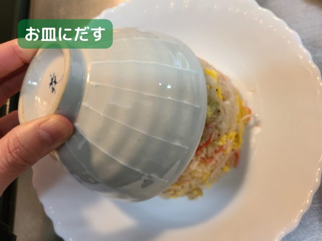 17.お皿の上にお茶碗に入れたチャーハンを出して盛りつける。