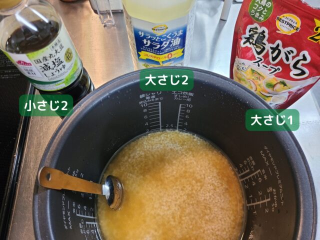 3.米が吸水したら、中華風練り調味料大さじ1、サラダ油大さじ2、しょうゆ小さじ2を加える。