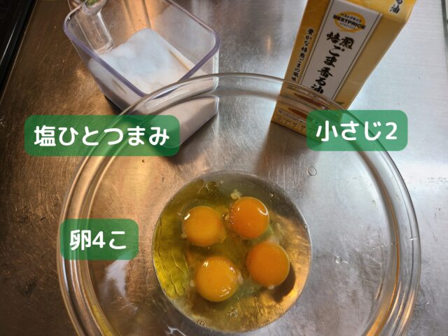 5.耐熱ボウルに、卵4こをわり入れ、塩ひとつまみ、ごま油小さじ2を加える。
