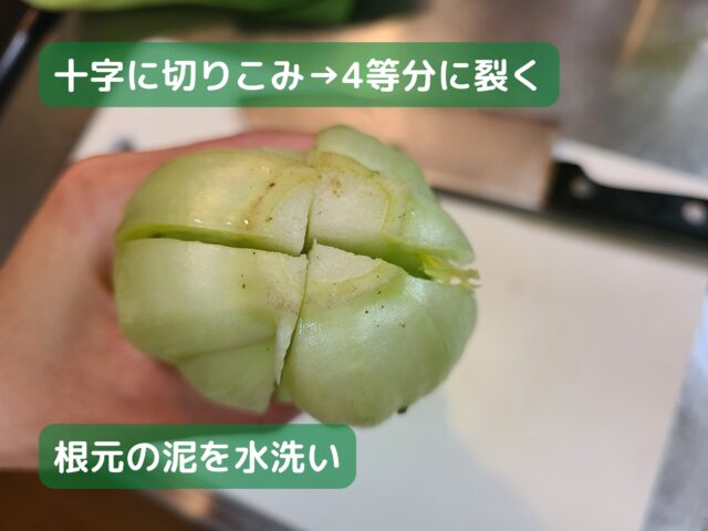 裂いたら根元に残った泥を水洗いしてしっかりと落とす。
