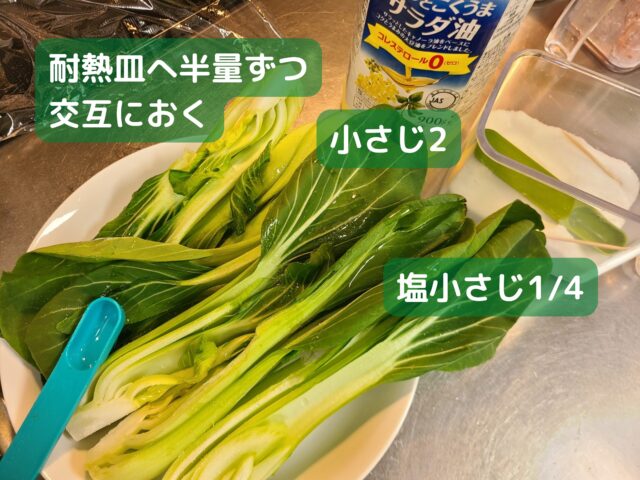 チンゲン菜にサラダ油小さじ2と塩小さじ1/4をまぶす。