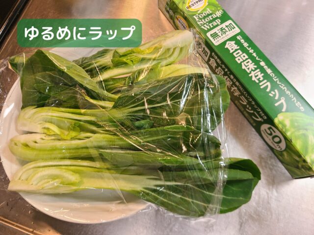 3.チンゲン菜にふんわりとラップをかぶせる。
