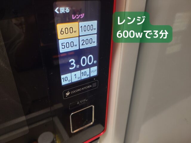 600Wで3分加熱すると、ほどよく食感が残る仕上がりになります。