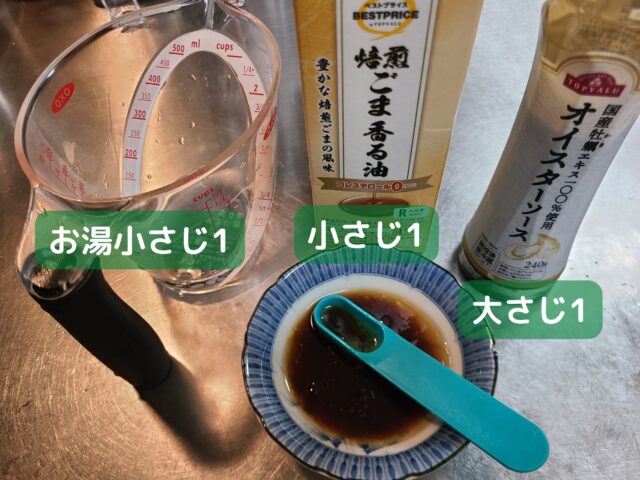 オイスターソース大さじ1、ごま油小さじ1、お湯小さじ1を溶いておく。