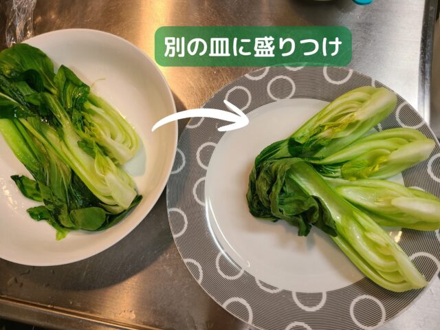 7.水気を切ったチンゲン菜は、葉を中心にして円を描くように別の皿に盛りつける。