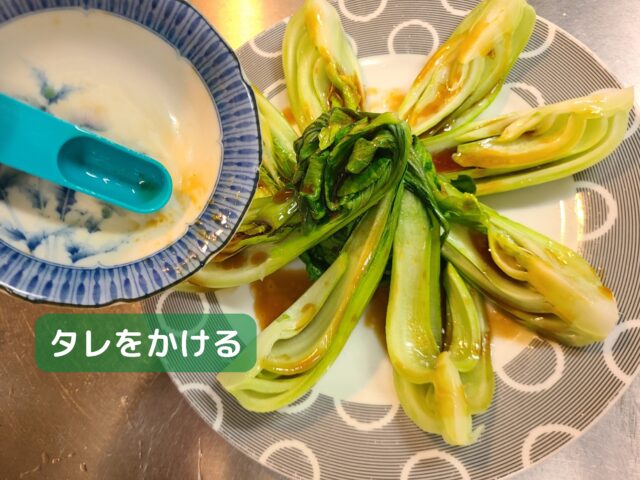 8.用意しておいたタレをチンゲン菜にたっぷりとかける。